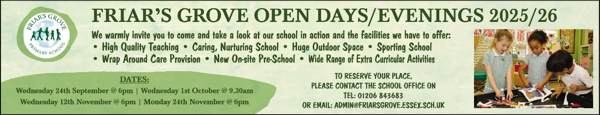 To reserve your place, please contact the school office on Tel: 01206 843683 or email admin@friarsgrove.essex.sch.uk